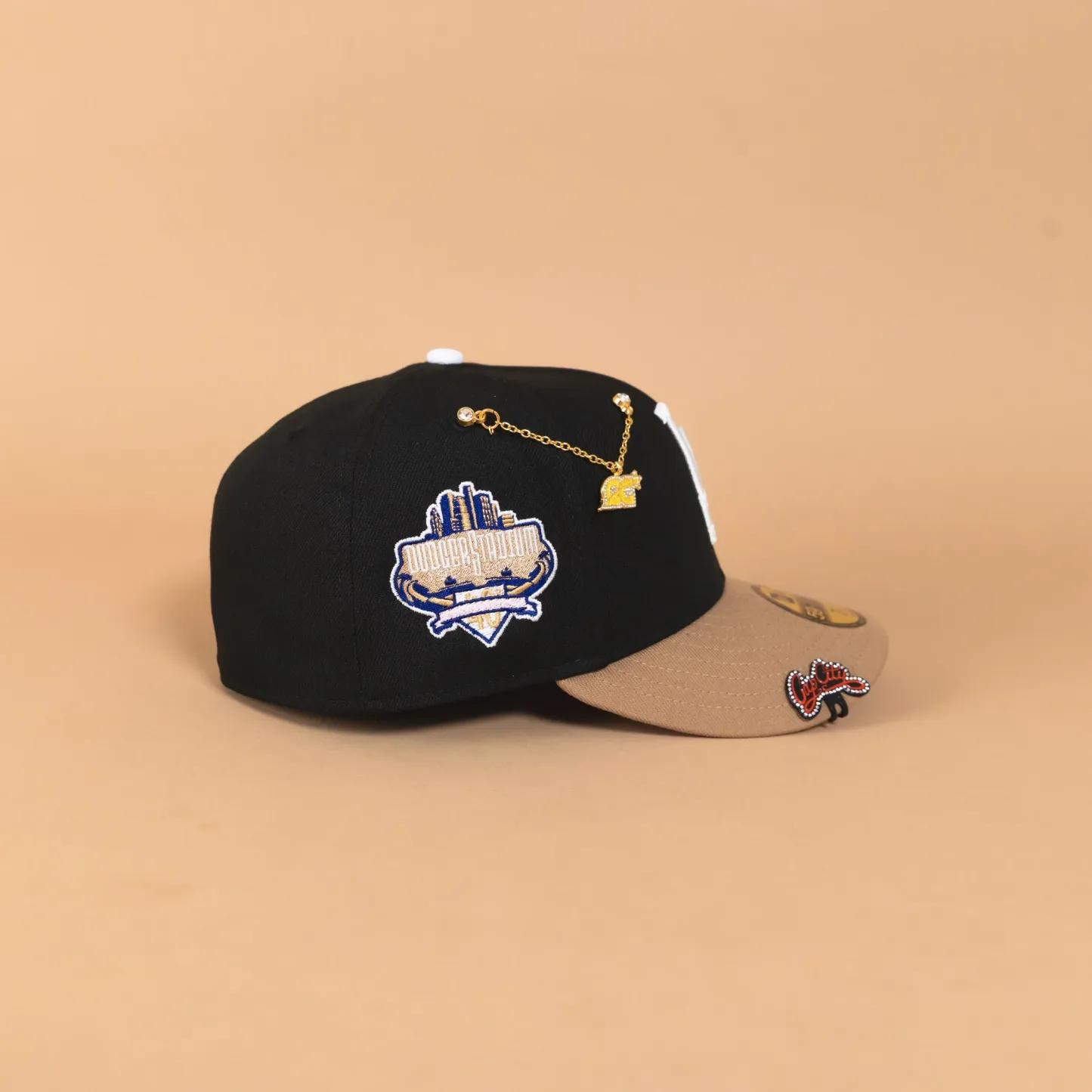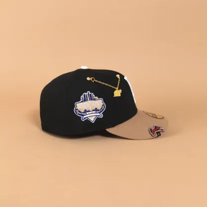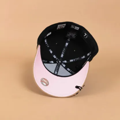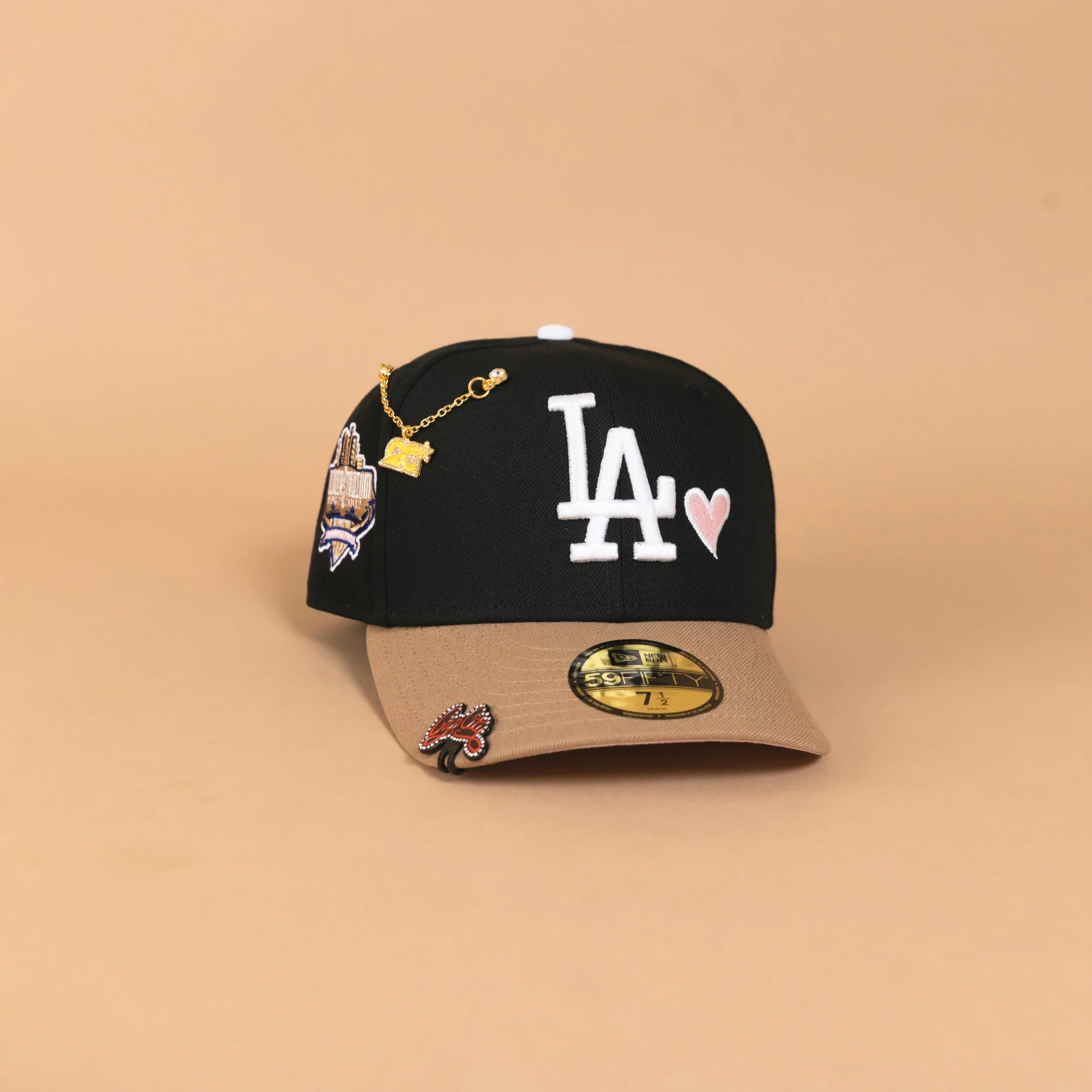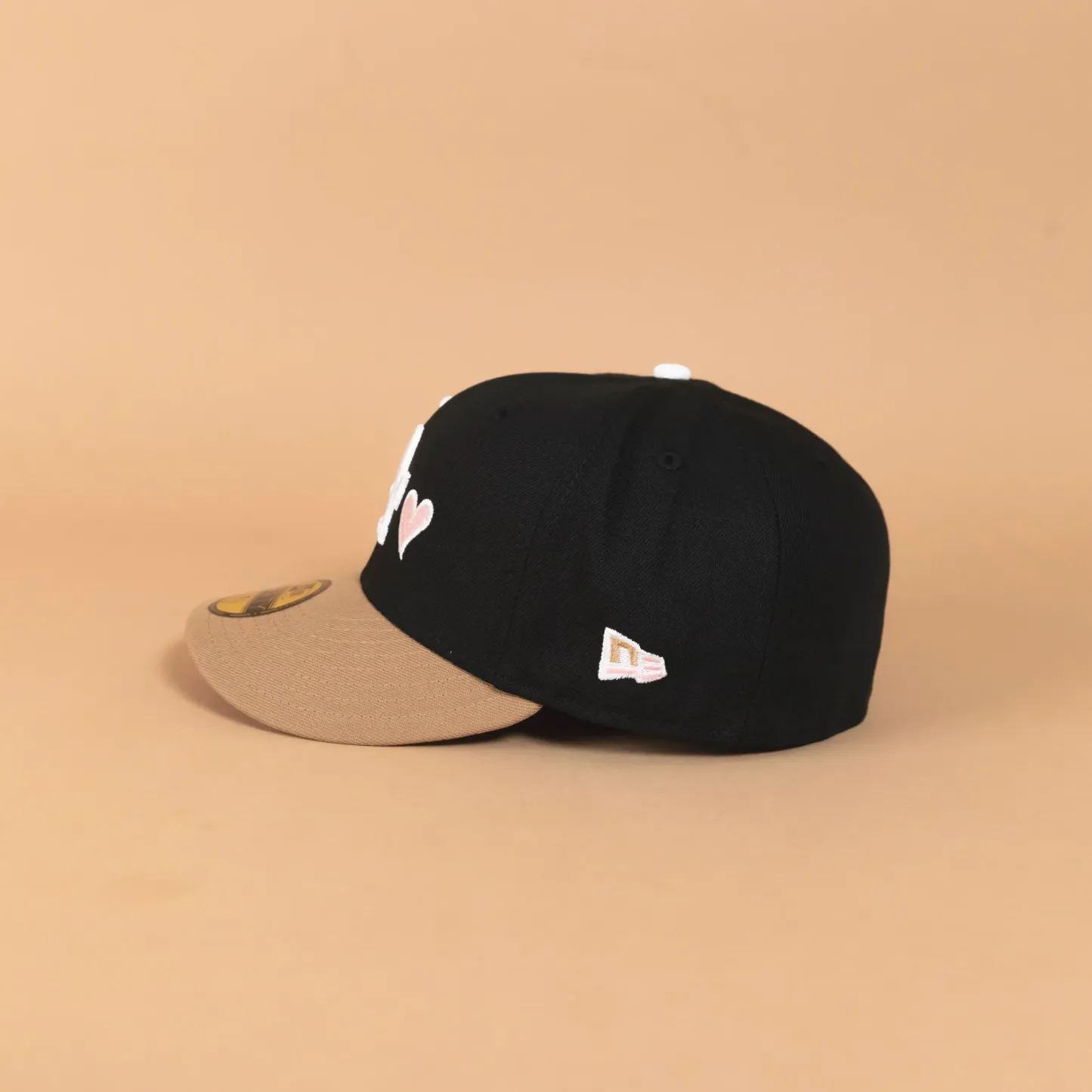 NEW ERA EXCLUSIVE 59FIFTY BLACK/ KHAKI LOS ANGELES DODGERS W/ PINK HEART + 40TH ANNIVERSARY SIDE PATCH