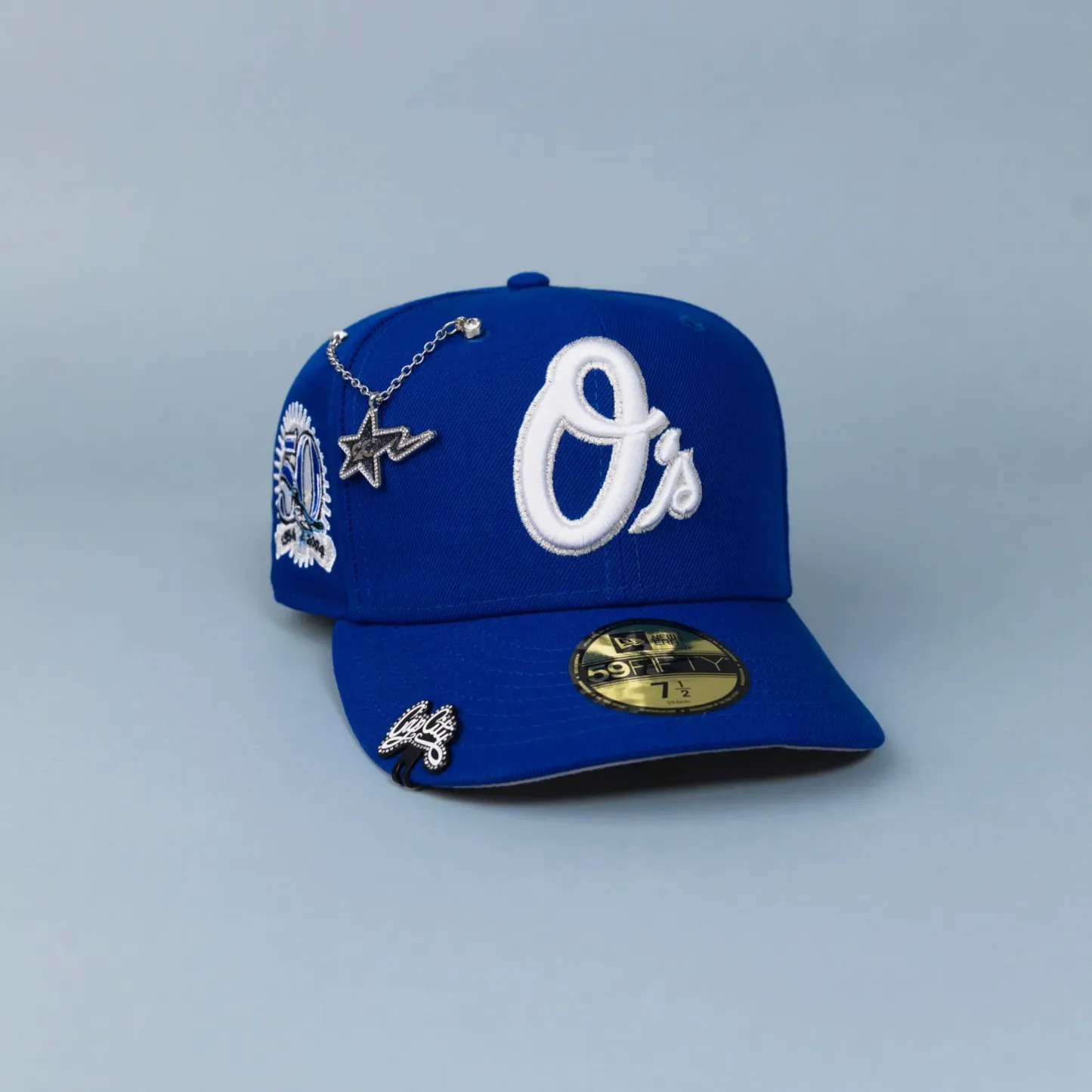 NEW ERA EXCLUSIVE 59FIFTY BLUE BALTIMORE ORIOLES W/ 50TH ANNIVERSARY PATCH