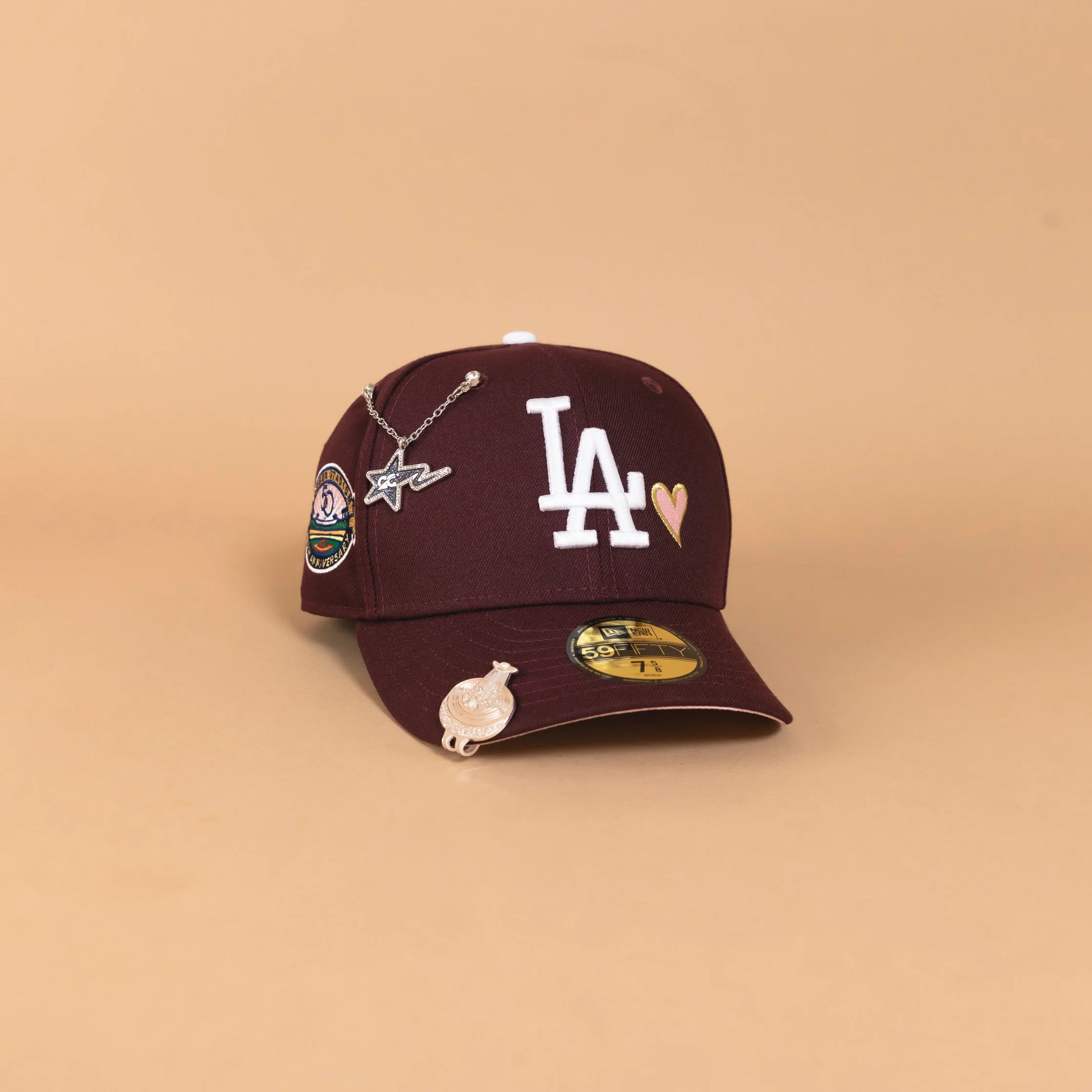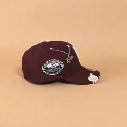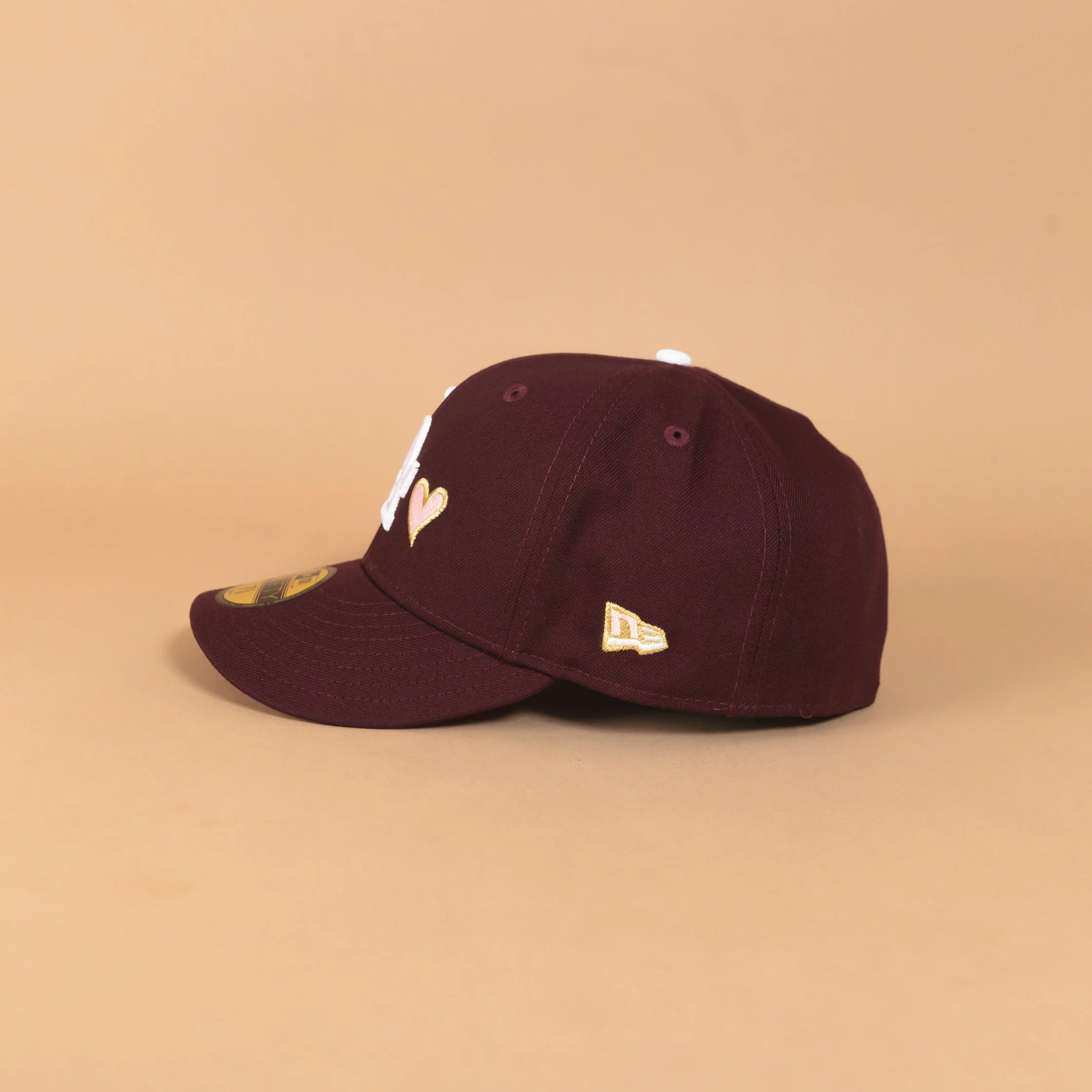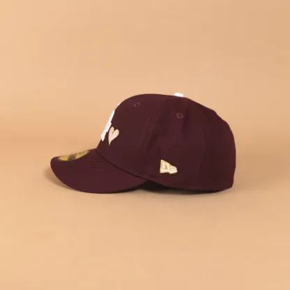 NEW ERA EXCLUSIVE 59FIFTY MAROON LOS ANGELES DODGERS W/ PINK HEART + 50TH ANNIVERSARY SIDE PATCH