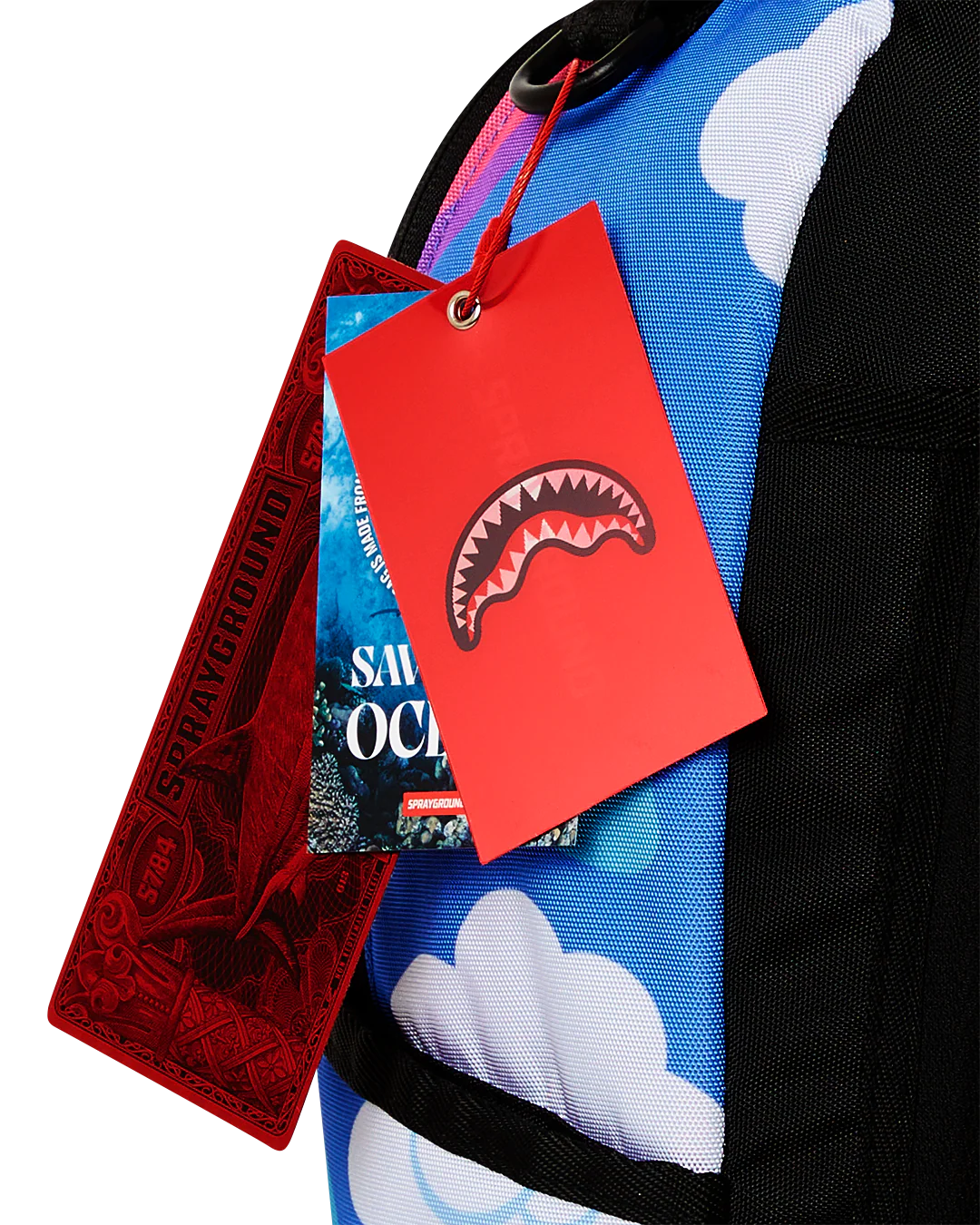 Dimensions: 18" x 6" x 11.5" • Front zipper pocket • Side pockets • Zippered Stash pocket • Separate velour sunglass compartment • Ergonomic mesh back padding • Adjustable Straps for custom sizing • Gold zippers with metal hardware • Metal "Sprayground Authentic" badge • Slide through back sleeve connects to carry-on luggage to free your hands