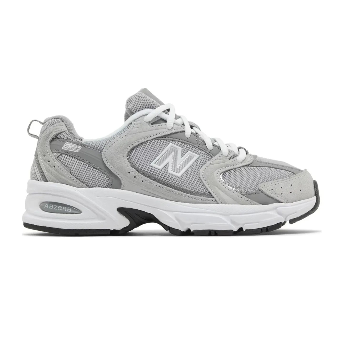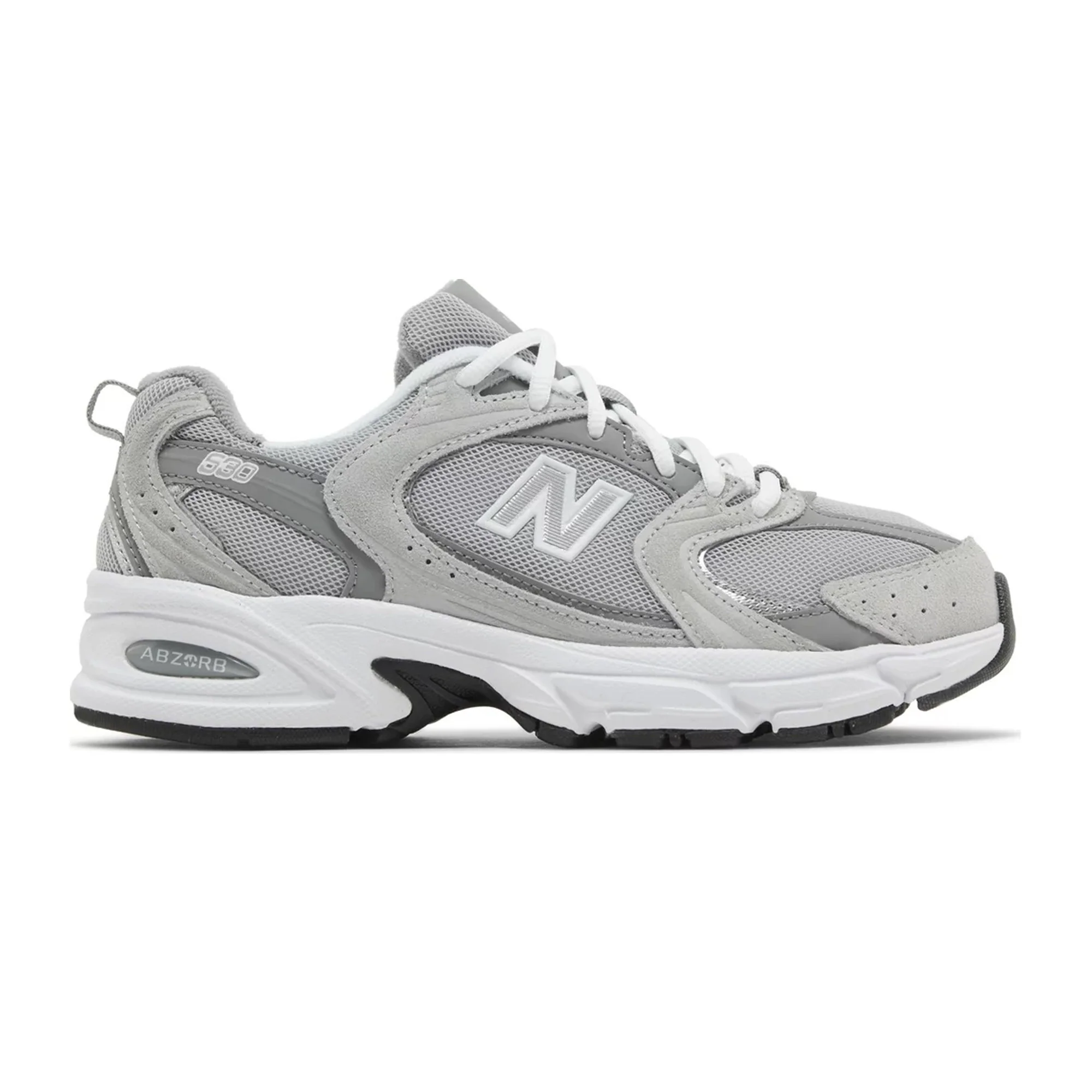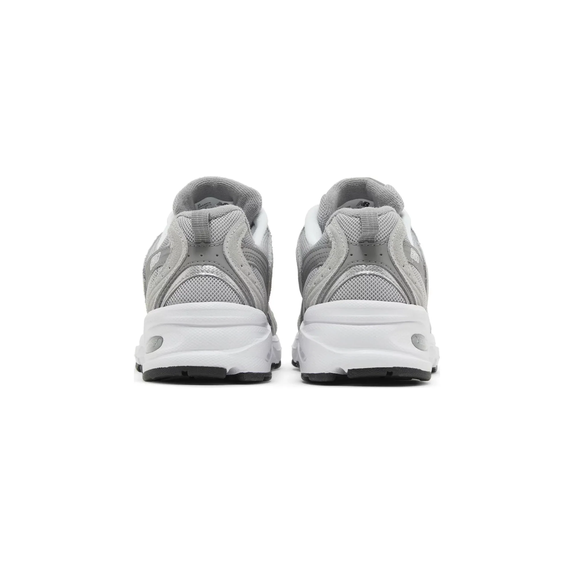 The New Balance 530 'Raincloud' features a sophisticated blend of materials, primarily constructed with a sleek mesh upper that is complemented by premium suede overlays. The colorway presents a muted palette of grey, reminiscent of a soft raincloud, allowing for easy pairing with various outfits. Subtle accents of navy and white pop throughout the design, including the iconic "N" logo and branding details on the tongue and heel. The cushioning technology, characteristic of New Balance, ensures maximum comfort, making this sneaker not just stylish but also practical for everyday wear. Additionally, the rubber outsole provides excellent traction, enhancing the sneaker's functionality.